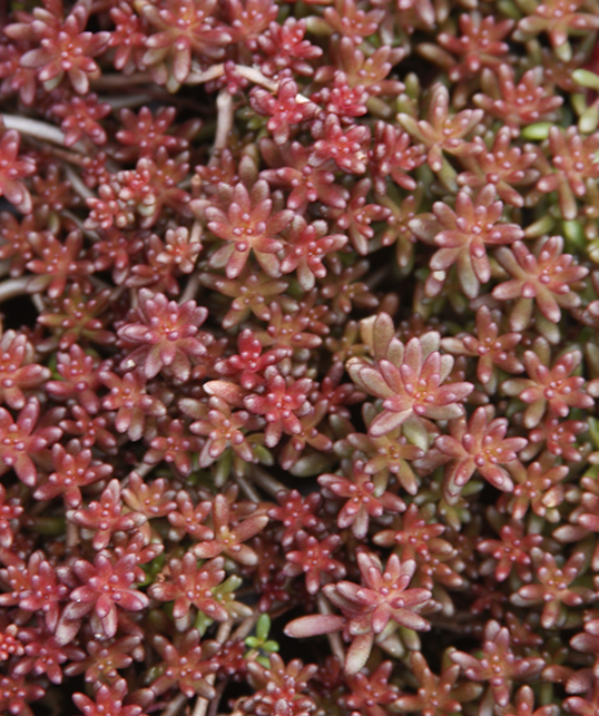 A four-season Sedum. Blue-green foliage in spring, turns blood-red in fall and winter. White flowers, early to mid-summer. Evergreen.